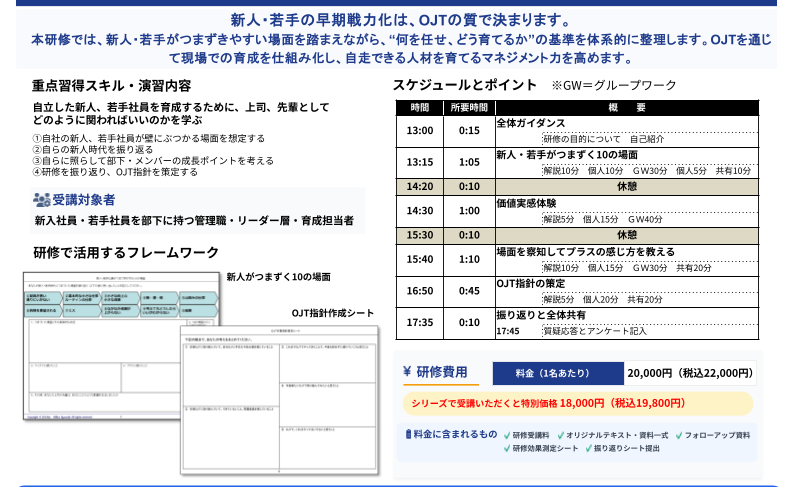 本研修では、新人・若手がつまずきやすい場面を踏まえながら、”何を任せ、どう育てるか”の基準を体系的に整理します。OJTを通じて現場での育成を仕組み化し、自走できる人材を育てるマネジメント力を高めます。