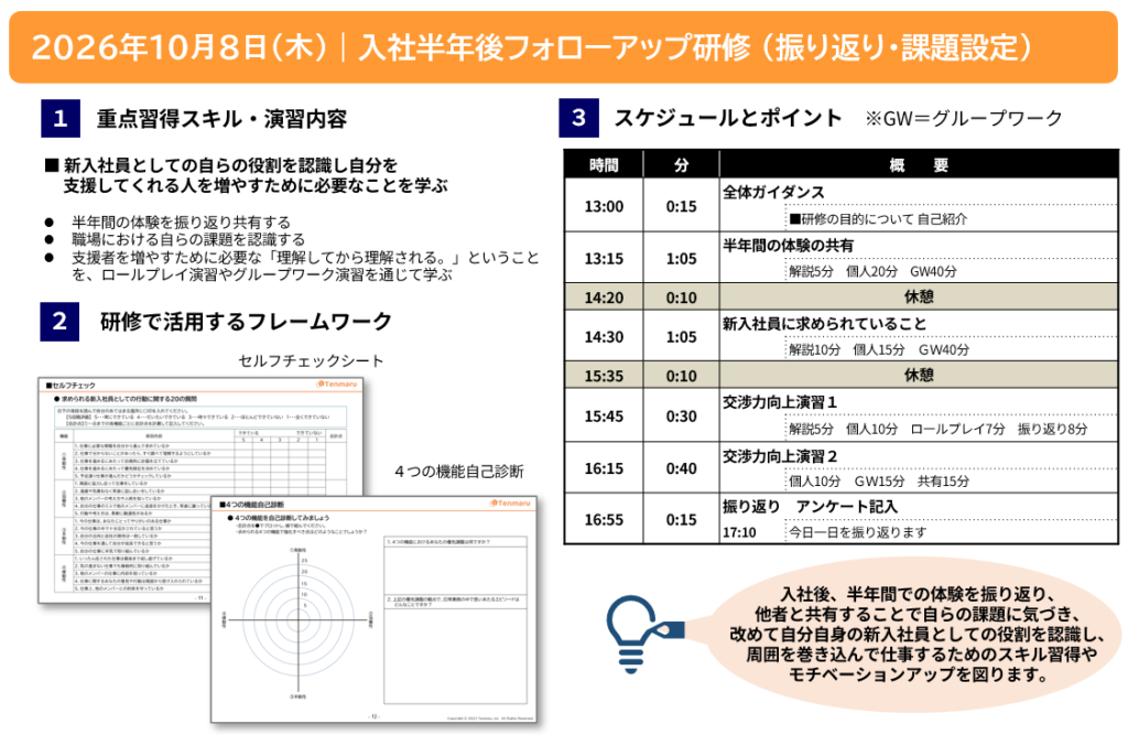このプログラムは、入社から半年を迎えた新入社員を対象としています。